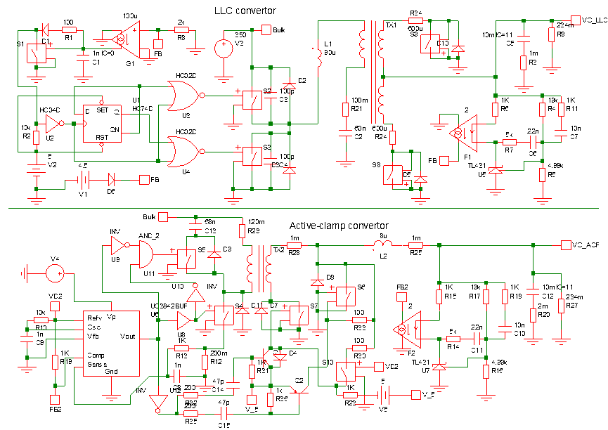 In this paper, scientific simulation software Simetrix was employed to carry out verification and comparison in order to objectively state the design considerations. For the modeling requirements, active-clamp and half-bridge resonant models should be constructed individually, and the models should include the complete circuit structure, supposedly composed of the primary-side controller (PWM), main switching element, transformer, resonance component, secondary-side rectification switching element, filter inductor, filter capacitor, and feedback unit. In order to simultaneously present the simulation results, an active-clamp model and a half-bridge resonant model were combined in a project, enabling them to perform simulated calculations. The design specification in this simulation was 12V(51.3A) 615W single output, as shown in the diagram below (upper half: LLC convertor; lower half: active-clamp convertor).