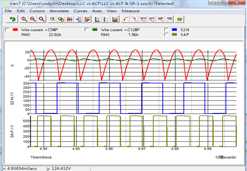 The simulation focused on the ripple current value of the output capacitor. With the loading condition set at “full load”, the ripple current values of C5 Capacitor (output capacitance of LLC) and C12 Capacitor (output capacitance of active-clamp) were measured. The measurement results are as shown in the waveform below. The current value of LLC (C5) was 22.82A, and the ripple current value of active-clamp (C12) was 1.96A, far lower than that of LLC.