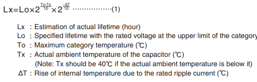 The infiltration rate of the oxygen is depend on the temperature as the liquid electrolyte evaporation and the relationship follows the Arrhenius's Law, too. Similarly, thermal degradation of the conductive polymer by self-heating follows the Arrhenius's Law, too. Therefore, the lifetime estimation has been using the theory of lifetime reducing by half at every 10℃ rise of the ambient temperature.
