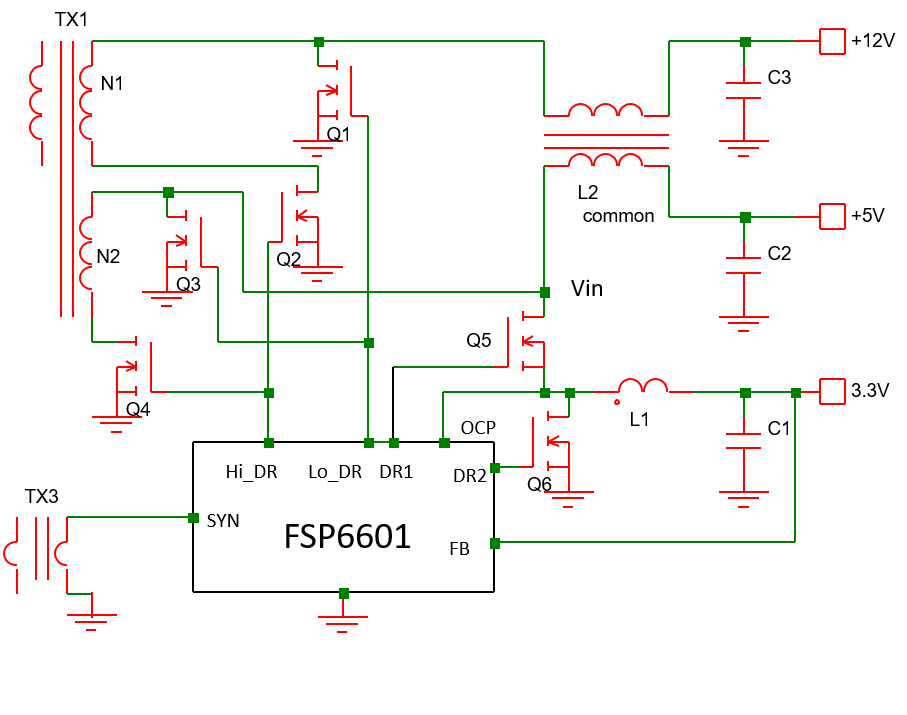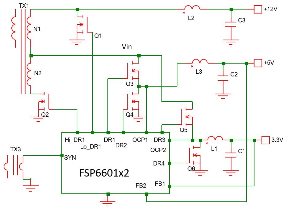 Figure 1 and Figure 2 show the pulse input DC to DC converter method used in Active-Clamp. The circuit design in Figure 1 is often used in specification requirements of output voltage precision of less than 5%. 12V and 5V feedbacks are tied together and share a common energy storage inductor, allowing 3.3V to adopt the pulse input DC to DC converter to achieve high-precision control. One FSP6601 control IC can be used. The circuit design framework in Figure 2 is used in high-end products with more stringent output voltage control precision requirements. The pulse source is tapped in the middle of the 12V transformer to provide 5V and 3.3V pulse input DC to DC conversion. Two FSP6601 control with IC design have independent feedback to achieve voltage high-precision requirements.
