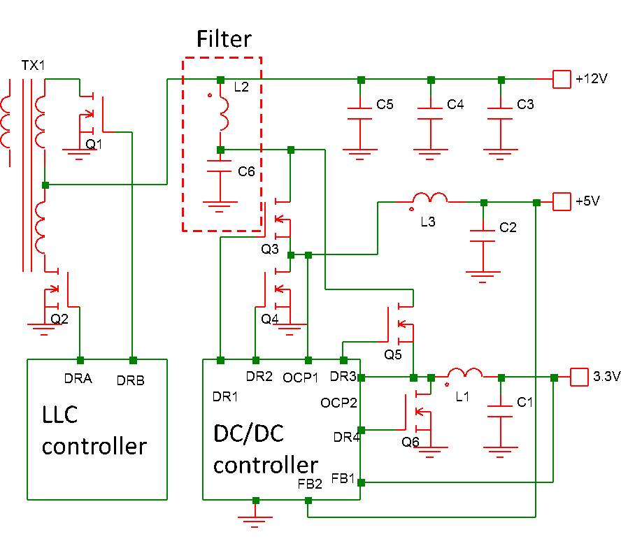 Another type is known as the DC input DC to DC converter. It can be used in the LLC circuit framework, converting 12V into 5V and 3.3V output (as shown in Figure 3). Basically, the 5V and 3.3V DC converter is added to 12V output, and 12V directly supplies current to the DC to DC converter. In consideration to the impact of the DC to DC converter pulse current on 12V ripple performance, a set of low-pass filter constituted by an inductor and a solid capacitor is usually added to improve the impacts caused by the ripples. However, low-pass filter will bring about additional loss and affect the overall efficiency.